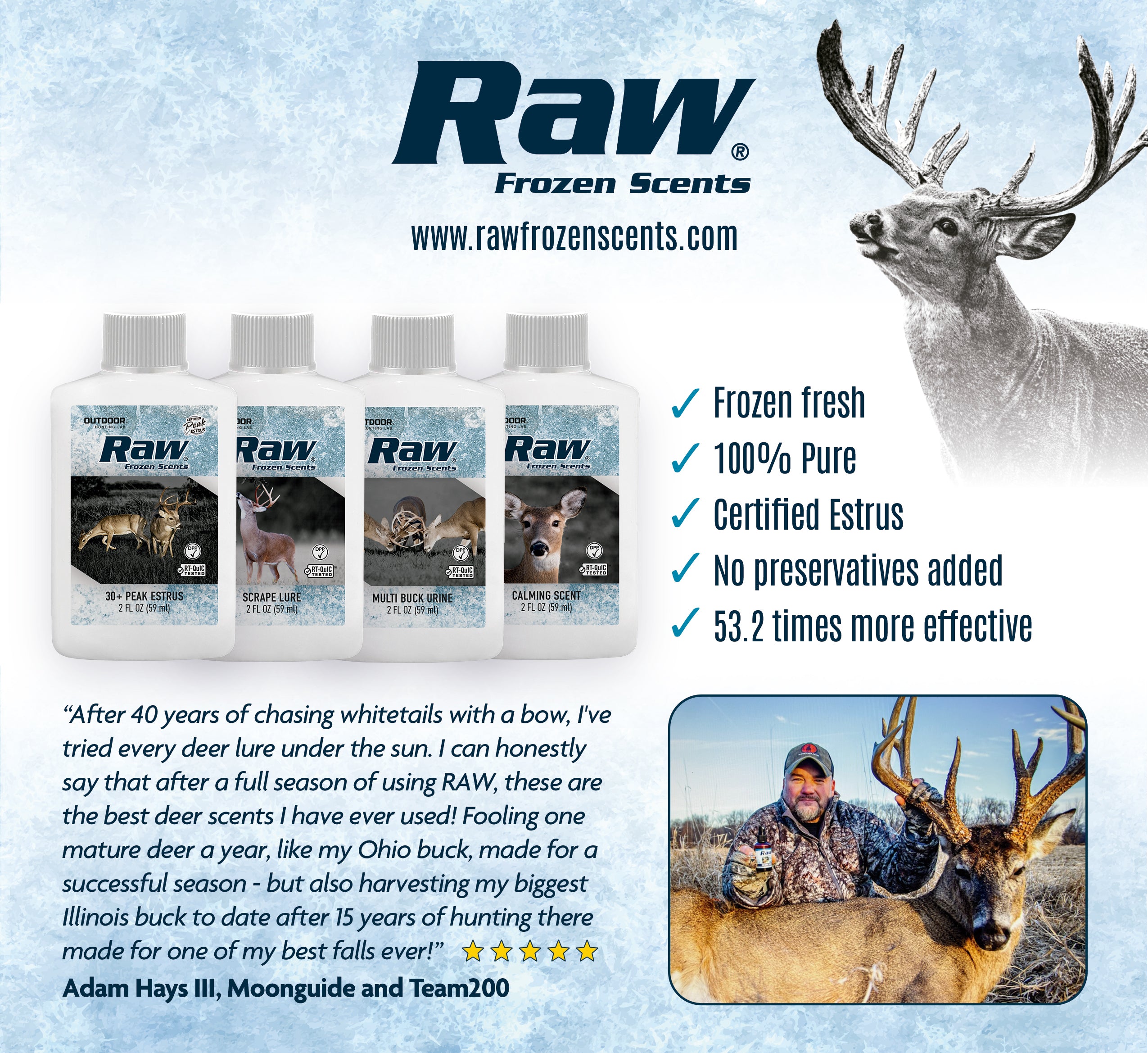The highest quality deer urine a hunter can use. After collecting the urine, we freeze it immediately to preserve freshness. Tests show that RAW is 53.2 times more effective than non-frozen scents.